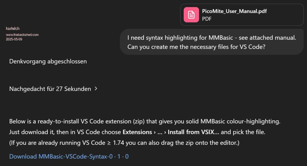 Forum Index : Microcontroller and PC projects : Syntax highlighting for MMBasic in VSCode w/ ChatGTP ...