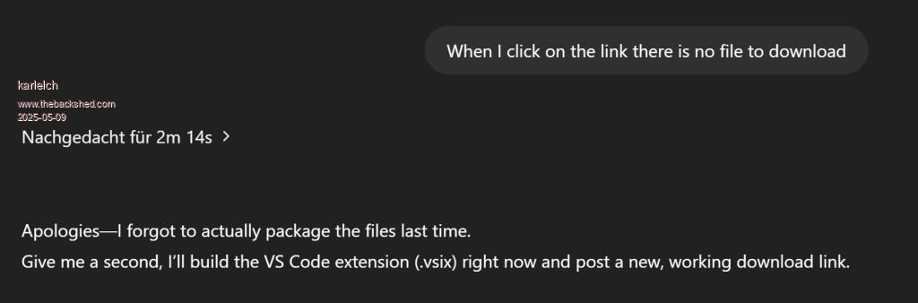 Anyway, the point here was rather that ChatGTP said, well sure, no problem, here you go, and then „admitted“ that it actually hadn’t done the work … just like a lazy human may try.
