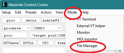 At the bottom of the Mode menu is File Manager. Click it and the MaxiMite File Commander will appear.