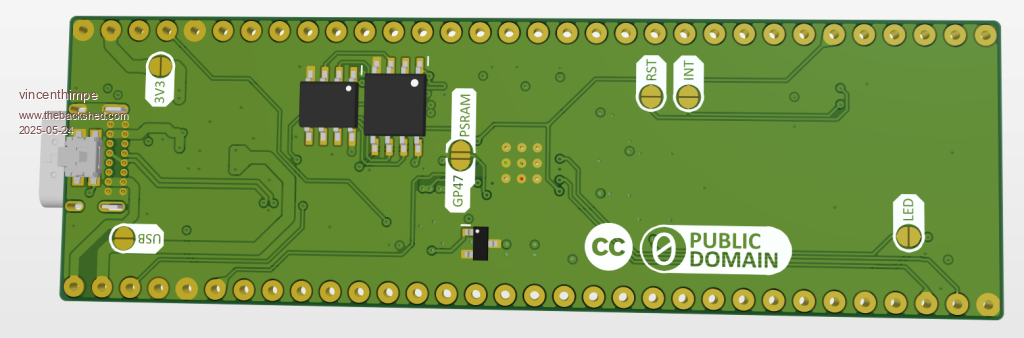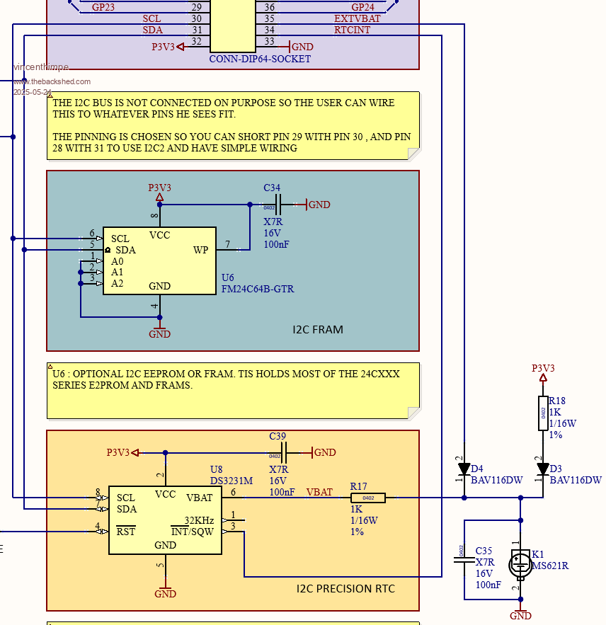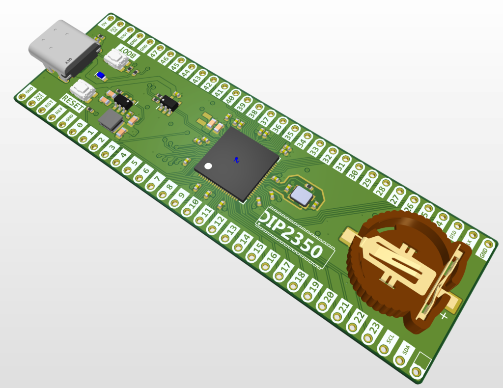 GIThub Link An RP2350 Packaged as a 64 pin DIP package. This can run MMBasic or CircuitPython or anything you want. The intended use is as a MICROCONTROLLER in an EMBEDDED application, not as a computer. Think STM32, PIC32 kind of application. Using a standard DIP64 allows simple thru-hole construction , breadboarding etc. it fits a standard 64 pin socket. No need for castellation or weird pin spacings - USB Type-C connector. Right angle , thru hole for mechanical stability. Long overhang so you can have this go through an enclosure wall. - USB powered or self powered. Self powered up to 12 volt. - Ideal diode / or-ing / e-fuse circuit (optional) to prevent backfeeding usb. - Current limit on the ideal diode. The circuit can be used as a power or-ing to provide backup power from a Li-Ion cell and charger - ESD protection on the USB port using TVS diodes - 3v3 DC/Dc regulator can deliver up to 1A of load current. In this case you need to provide 5v as USB cannot provide source current. - RP2350B in 80 pin QFN with all 48 GPIO brought out. - Flash 128Mbit - optional PSRAM on GPIO47 - optional 3v reference for analog circuitry LM4040-3 - Heartbeat led on gp25 with solder bridge. Can be removed from circuit. - Using Abracon XTAL and polarized inductor for 1v1 regulator - Boot and Reset button. Secondary boot button under usb so you can use a paperclip through the enclosure to force boot. - on board, optional i2c bus : I2C EEPROM or FRAM I2C RTC with battery backup 1220 cell. - cheap version using an M41t11 - precision using a MEMS DS3231. Option to use brown-out detection to hold cpu in reset till power stabilizes. Optional interrupt on GPIO21. User needs to wire the i2c bus to desired io port. - 4 layer board with controlled impedance and power planes. Board designed so it can be made at OshPark, JLCPCB or PCBway - CAD source available under Creative Commons ZERO . Public Domain License. Altium Format. - Production pack (gerber/drill/bom available. - BOM is procurable from Digikey/Mouser as well as LCSC (Asia) with direct LCSC order codes if you want this to be partially assembled by JLCPCB. - Pinheaders to be used are the turned pin type. Not the square Dupont style that destroys breadboards and ic sockets. Preci-Dip or equivalent. Comments welcome |
