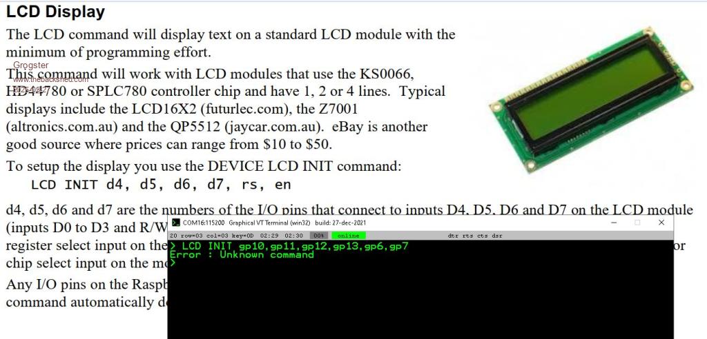 ....and the following page on how you write to the LCD module, is also generating unknown command errors. ![]() Perhaps I am the only one on Earth now, trying to use these old legacy LCD modules. ![]() EDIT: DEVICE LCD command fixes this issue, as you might expect, but I think the manual needs a tweak here. ![]() Edited 2025-05-27 17:18 by Grogster Smoke makes things work. When the smoke gets out, it stops! |