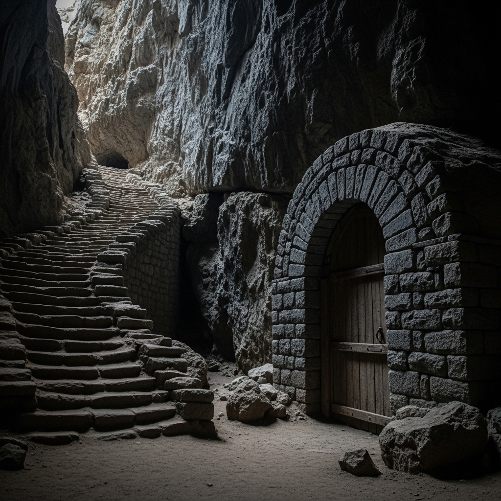 I asked Google Gemini: Generate an image of a cave with a stone stairway on the left-hand side and a wooden door in an archway on the right-hand side. ![]() 'no comment |