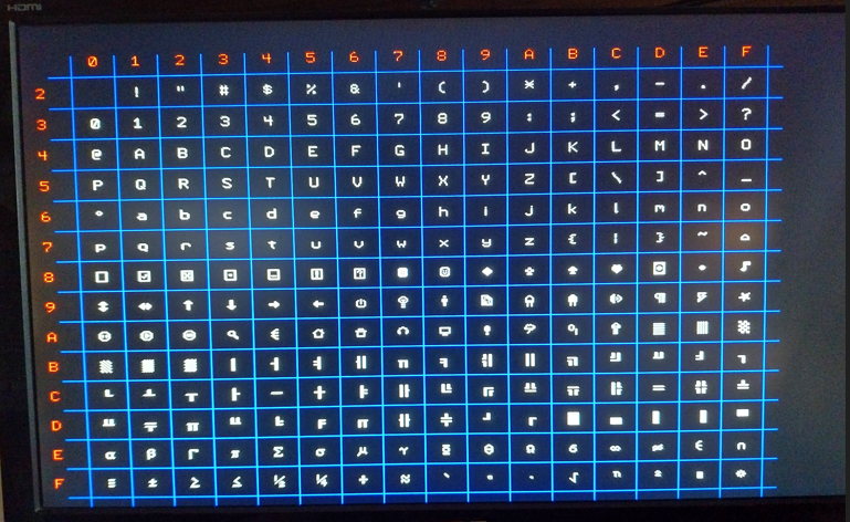You must be looking at a different picture. The one I'm seeing (with the accented characters) has 8 rows of 32 glyphs, which was 256 last time I checked .Best wishes, Tom Edited 2025-07-16 18:26 by thwill MMBasic for Linux, Game*Mite, CMM2 Welcome Tape, Creaky old text adventures |