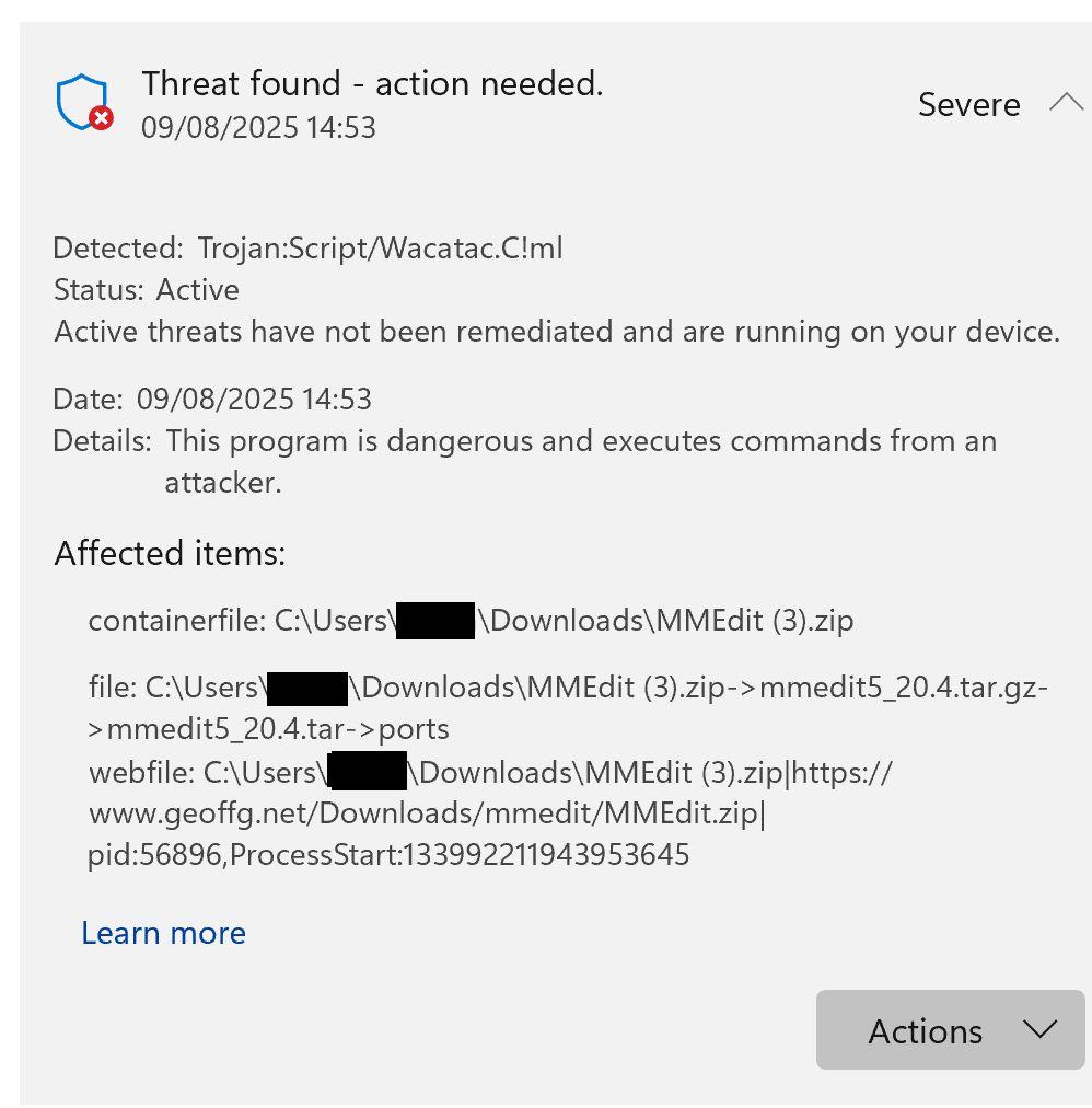 Is this a real threat?  I have downloaded MMEdit on many occasions and although Defender warns about it being unknown software and so on, this is the first and only time that I have found it to be automatically quarantined and flagged up in this manner.