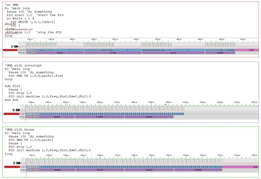 Ok, a non blocking solution could be, using a Timer-Interupt with precalculated delay. 'Do 'main loop Do ' do something Do : Loop While Busy 'wait for ready Memory pack leds(),pack(),1024,32 'copy and pack Busy = 1 'set busy-flag PIO DMA TX 1,0,1024,pack()',FinI SetTick 29,FinI,1 ' 29us/24bit Loop End 'subs/functions ------------------------------------------------------------- Sub FinI 'stop the PIO and re-init for next run SetTick 0,FinI,1 PIO stop 1,0 PIO init machine 1,0,Freq,PinC,ExeC,ShiC,0 Busy = 0 'ready to start End Sub But is this the right way/solution? Albert |