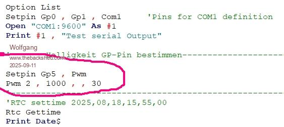 Hi Wolfgang, You can assign a PWM to control the backlight (i.e BL=GP5) ![]() Using the MMBasic "BACKLIGHT n" command you can assign a brightness value. This value can be taken form an ADC reading of a light sensor, or from a calculated time. So you do not have to control the PWM yourself. This all is supported by MMBasic commands. Volhout Edited 2025-09-11 23:55 by Volhout PicomiteVGA PETSCII ROBOTS |