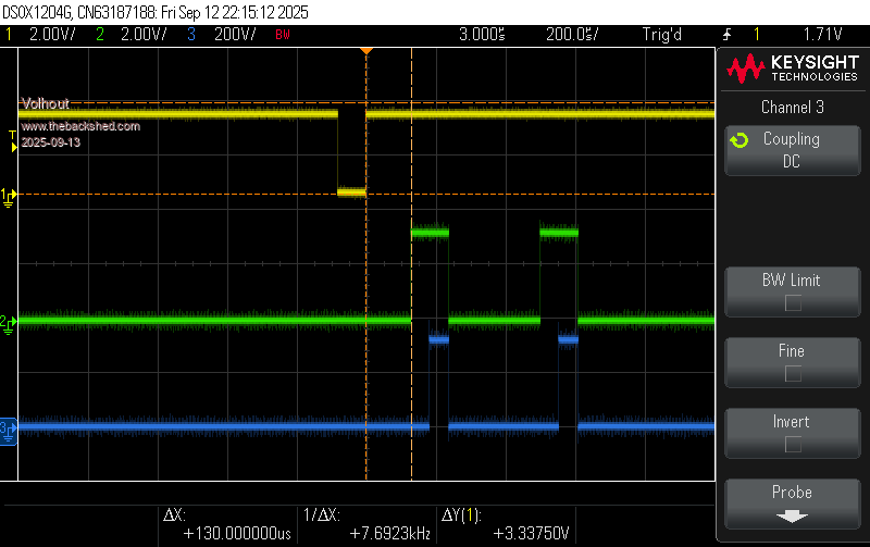 Pin1 : a rising edge arrives fire interrupt handler 2. This is the scope signalling it has started the sweep