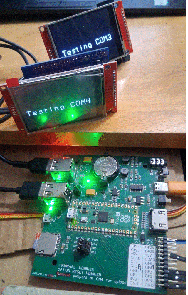 I got it to work with this module (Peter's): ![]() I plugged a RP2350A-Zero pcb with ILI9341 LCD directly into one of the board's USB connectors, got recognition, did OPEN "COM3:9600" as #1 and then PRINT #1, "CLS RGB(BLUE)" and got a blue screen. But the PCB didn't supply enough power to do much more--it would restart. So now I'm looking for a USB-A to USB-A cable for my powered hub. I'm pretty sure I used one back in December for something. Found one--right in front of me, connecting to my USB-3 HDMI recorder. But it's not working with the powered hub, which has switchable USB ports. I switch one on, and nothing happens on the host. I tried another powered hub--no joy. Is this an issue of a hub being plugged into another hub (on the HDMI PCB)? Ok, I plugged the two into the HDMI PCB. Then: > open "com4:9600" as #2 > print #1,"Text mm.hres/2,mm.vres/2,"+chr$(34)+"Testing COM3"+chr$(34)+",C,,3" > print #2,"Text mm.hres/2,mm.vres/2,"+chr$(34)+"Testing COM4"+chr$(34)+",C,,3" ![]() Pretty nifty. So how do you power locally? ~ Edited 2026-04-05 11:20 by lizby PicoMite, Armmite F4, SensorKits, MMBasic Hardware, Games, etc. on FOTS |