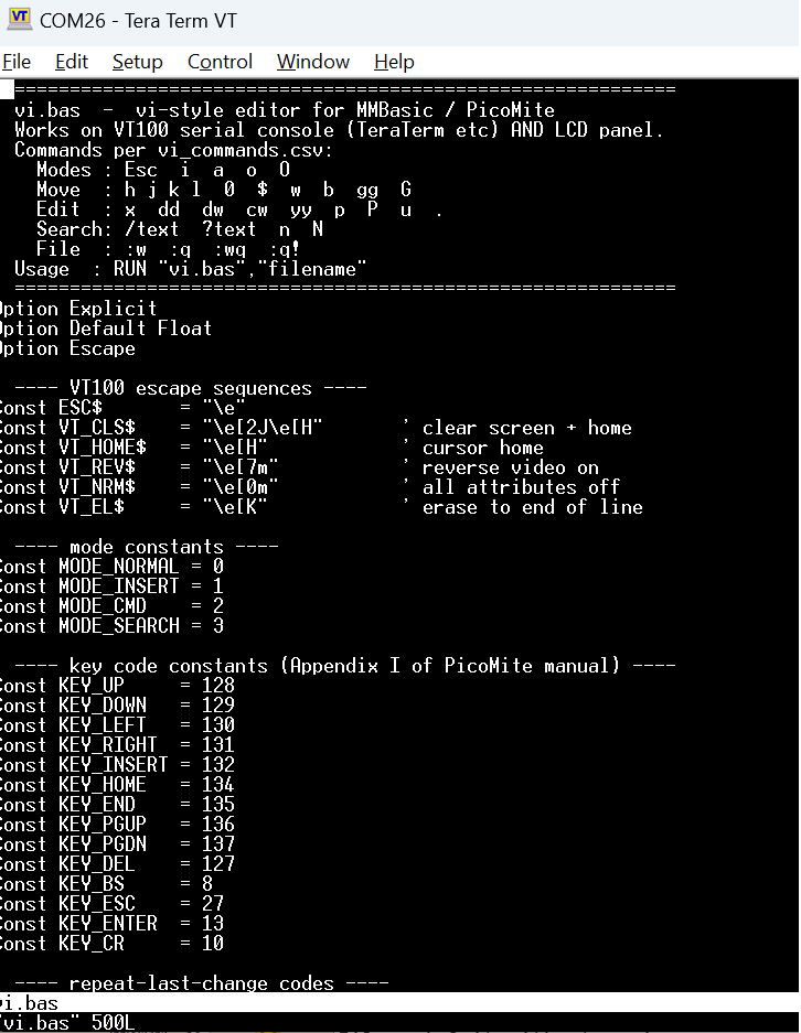 I started it with run "vi.bas" "vi.bas" (to edit itself). The first pass failed because it wanted to use CALL subsomething() instead of just subsomething(); then failed because I was using TeraTerm, not a display, then failed because of a trivial mistake (VAL used on an mm.info return which was already a number). Then it displays correctly including scrolling to a new page. I haven't tested any commands (because I hate vi). 1100+ lines of code provided while I was doing other things.