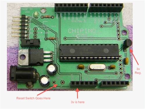 I stand by my statements, and you have done nothing to disprove them. [/quote] See the picture below. Self-servng spam. Has nothing to do with my remarks. [/quote] This wasn't meant to be spam in anyway. I'm sorry of my post offended you. I am just helping muddy0409 get an accurate answer to his original questions. All you did here was verify that my first remark was true. The 3/5V option was indeed removed without notice to the paying customer. [/quote] I have notified them and they are correcting the picture. Apparently In the move from chipaxe.com website to howtronics.com website they didn't catch that mistake and have notified the guy who builds the website. But I just downloaded the documentation from their site and it has the correct schematic and doesn't show any 3v jumper. I know they have some old boards if you want that feature, I know they'll send you one. They are just a great group of guys who are very familiar with PICs and PICBASIC and just having fun. They've donated over $1200 to charity through their $1 per CHIPINO board sold program. I think its a great. They've now expanded and formed a hackerspace that they call howtronics (how to electronics). I did join the hackerspace. I do the same promotion for Maximite and have sent many people to Dontronics for Maximite and Duinomite boards. Well, let's see. -- the 3/5V option is clearly shown in the schematic available when I bought the unit. -- the 3/5V option was clearly in the photo when I purchased the unit. -- the 3/5V option remains clearly in the photo of the unit to this day. -- the 3/5V option was clearly listed in the construction steps for the bare board option. -- the 3/5V option remains clearly in the photo of the bare board sold to this day And yet you claim that you (oops, sorry, I mean the "Chipaxe Team") never "advertised" the 3/5V option. [/quote] You were right and they are correcting the pictures. Thanks for pointing that out. You can plug a 3v PIC in and power from the PICkit 2 at almost any voltage you want. Perhaps you would be good enough to point out the reset switch (S1) on the Chipino I bought. Here are photos of the front and back. [/quote] No problem. The reset switch location is pointed to in the picture below. Did you build the kit or buy it this way? It should have the switch. If you add a shield with the reset switch, it will also connect to the MCLR pin so you don't even have to populate it. The shield will do the job.