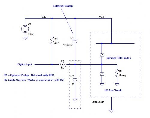 Grog, The circuit may make more sense to you if drawn differently. It is a simple diode clamp circuit that you have likely seen many times. The diode does not conduct current until the voltage approaches Vdd. The higher the voltage the more the diode conducts, keeping the voltage at the PIC I/O pin at no greater than Vdd + .2V (I added D2 which also adds protection again voltages below ground.) Note that the PIC already has internal protection (ESD) diodes on all digital capable Pins except MCLR. The External Diode(s) offer more protection.