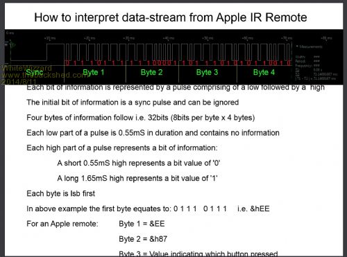 It shows a Logic Analyser screen-shot (download below) of the IR signal; along with instructions on how to interpret it.