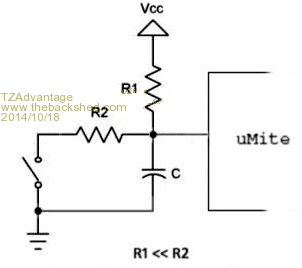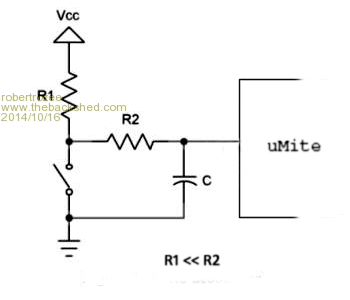 it addresses your concern about shorting out the capacitor (in theory a quite valid concern), and provided R1 is much less than R2 then ramp up and ramp down times will be fairly similar. the micromite digital inputs almost certainly go through schmitt triggers, so this circuit will work well. t = 0.7 x R x C (approximately) for t = 1mS, reasonable values would be R1 = 1k5, R2 = 15k, and C = 0.1uF. while the button is held pressed about 2mA will flow if R1 = 1k5. rob :-) |