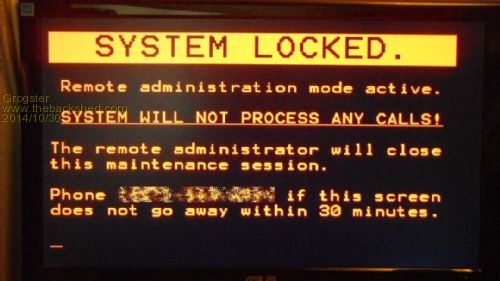 Playing around with the VT100 tonight. I plan to use this as a static message display when I use the Internet to remote-administer a CMM-based system. The VT100 board shows this message, and switches a KVM switch to switch the actual VGA side of things, and also isolates the local keyboard, so staff can't interrupt or otherwise upset the remote access of the system.