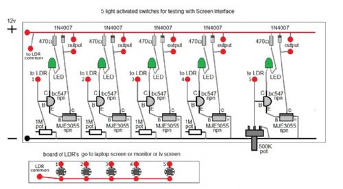 Hi all, this is my first post and I've got to say I am very happy that I found this forum. I would like to show an idea I had years ago when I was playing with the commodore 64 and I needed more output ports. Now I'm using a windows laptop and one of my WIP projects is controlling my telescope while I'm inside where it's warm and no mozzies. hehe... It's very simple really. Just by turning little white squares on and off that are lined up with light dependent resistors as part of light activated switches, it can be easy to control many outputs. And by just varying the brightness, fully variable control is possible too. Here's some pics. :)