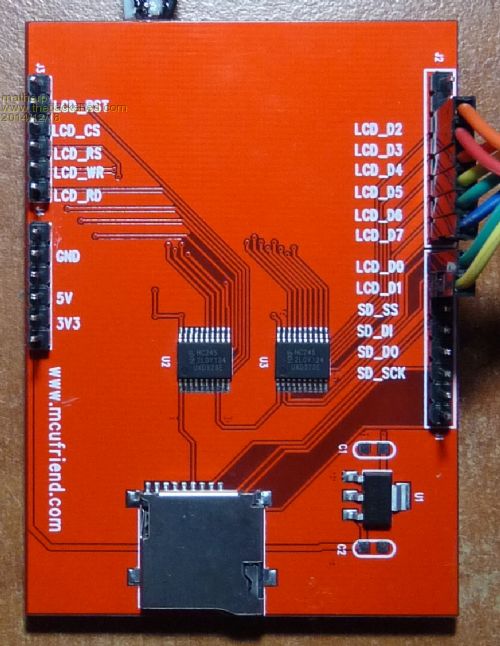 The bottom of the display should be silkscreened as above connect: LCD__CS to Micromite Pin 4 LCD__CD to Micromite Pin 5 LCD__WR to Micromite Pin 6 LCD__RD to Micromite Pin 7 LCD__RST to Micromite Pin 14 LCD__D0 to Micromite Pin 17 LCD__D1 to Micromite Pin 18 LCD__D2 to Micromite Pin 21 LCD__D3 to Micromite Pin 22 LCD__D4 to Micromite Pin 23 LCD__D5 to Micromite Pin 24 LCD__D6 to Micromite Pin 25 LCD__D7 to Micromite Pin 26 You also need to connect 5V, 3V3 and GND The touchscreen code I listed won't work as I have butchered my display to break out the touchscreen pins from the shared pins on the normal board. Use this code to get you going: 2014-12-18_155351_T24BAS_2.zip |