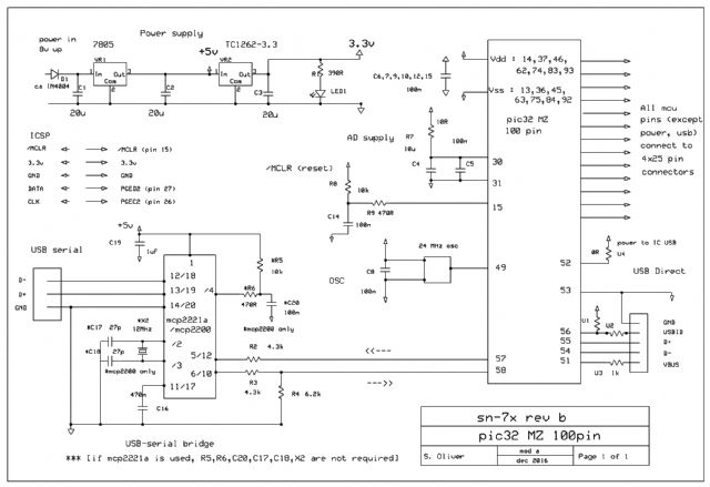 -Component list for sn-7x rev b- C1,C2,C3 Cap 20 uF uncritical 3528 C5,C6,C7, Cap 0.1 uF ceramic bypass 0805 C8,C11,C12, C14,C15 C16 Cap 470 nF ceramic 0805 C19 Cap 1.0 uF ceramic 0805 D1 Diode 1A D0214AC LED1 Led Green 1206 R1 Res 330 Ohm 0805/0603 R2,R4 Res 6.2 K for serial 0603 R3 Res 4.3 K for serial 0603 R8 Res 10 K for /MCLR 0603 R9 Res 470 Ohm for /MCLR 0603 IC1 IC pic32MZEF 100 pin tqfp/14mm IC2 IC MCP2221a tssop VR1 Regr 7805 5V TO-220 VR2 Regr TC1262-3.3 3.3v SO-223 X1 IC Oscillator 24 MHz eg Abracon ASDMB-24.000MHz-LC-T -Assorted hardware- 1 Barrel socket for powerlead 1 pin header, 6 pin RA, for ICSP/pickit3 4 26-pin sockets or pin headers (use dual-row 13 pin, remove a pin) 2 USB mini-B smd connectors -Optionals- [ For clean A/D measurements ] R7 Res 10 Ohm AD supply (replaces link) 0603 C4 Cap 10 uF AD supply filter 0805 [ Direct USB ] U1 Res 100 K Pullup (not required?) 0603 U3 Res 1 K USB power sense 0603 [also mcp2200 anciliaries if used instead of 2221a.] Pcb's can be made by oshpark or pcbway, both are pretty reasonable. |