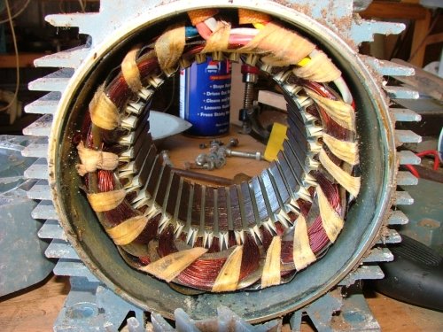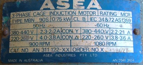 Its a 900 RPM 0.75kw 3 phase motor. The shaft diameter is 25mm, rotor is 90mm diameter and 65mm long. When looking for an induction motor for conversion, the lower the rated RPM the better, lower RPM means more poles, and more poles is good!. This one is 900rpm, and has 6 poles per phase. Each coil is easy to access, so I can seperate the coils and connect in series/parallel or parallel if required.