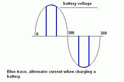 In my single phase example which is a perfect system with no inductance and no capacitance the alternator is turning at some speed where the peak voltage is only just a little above battery voltage, so it is only the peak voltage period that charges the battery. Lets say this peak volts period is only 30 degrees of each half cycle, or in other words only 33.3% of the time does current flow in the stator.