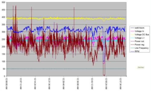 This is graphed data for a 1hour period. the mill produced up to 4.5kW at times. This is connected to a 48V RE battery bank, so approx 90A was put back at times to the battery [650Ah] through the Outback inverter/charger.