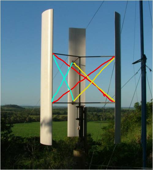 Now imagine the power you could create with three FULL blades.Startup would even be better but the support structure would need beefing I would run the supports from the center for the big guy if you build it.