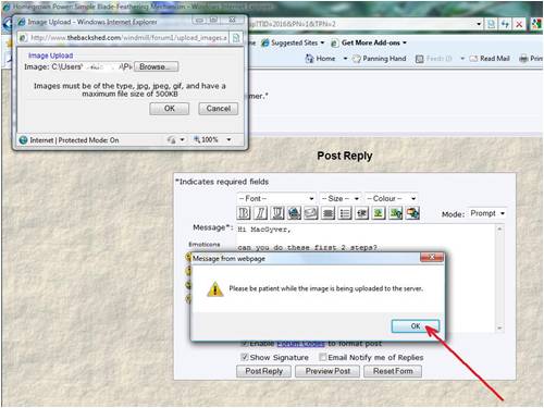 After you click the OK, it is best to wait for the link coding to appear in the Post Reply window. If you see some screens like these below, then posting pictures will be a problem.
