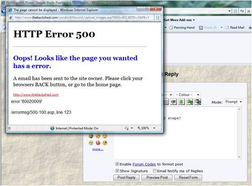MacGyver On the first point. If you have shaped the edges of the flat section evenly on both sides of the flat, then this is an airfoil. You may not have a traditional lifting section with high lift to drag ratio, but still a symetrical section of low form drag airfoil. On the second point. I have just quoted your post, and there are embedded text control characters in it. Many readers write in a program other than the Post Reply window. They then just copy and paste to it when ready. This can cause a narrow formatted post, that does not flow when the browser window is resized, and makes a posting fill more pages than should be required on a larger monitor. You should be able to test these aspects yourself. You might find it useful to spend a bit of time, editing your own posts and seeing how the text is layed out, and then find a way that works best with the forum. My browser sometimes comes up with an information line to get permission when uploading potentially damaging scripts. It would seem that your browser is blocking scripts. The scripts are a necessary part of the upload process, and you should be able to temporarily enable them to allow picture uploads etc. This is not a forum problem, likely a Mac/browser setting permissions problem at your end. Gordon. become more energy aware |
