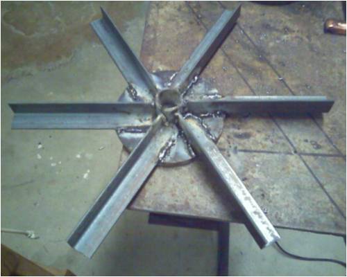 Hey Guys For my winter project, I've been working on my windmill when I get the time and it's coming along quite well. Typically windmills have 3 blades to achieve a higher RPM. I followed Glenn's idea for 6 blades, mine are about 7 feet in diameter. The 6 blades are to catch more wind for more torque while the blades still are angled as if there were 3. Hopefully this should still achieve high RPM for high output in higher wind conditions. I found the calculations for blade angle confusing and somewhat different from one article to another however I ended up choosing 9 degrees from the plane of rotation which I suspect should be a TSR of around 4. To match the input I've again used Glenn's stator design, to have a lower maximum output in favor of some power output in lower wind conditions, so the average monthly output should be significantly higher than the original plan. To do this the generator is wired into 3 separate generators with different voltage outputs so that the harder the wind blows the harder the generator works. I revised Glenn's design for one stator to have 3 stages. The first stage will cut in early by attempting to generate a max of around 90 volts by using 5 coils in series in a wye configuration. The second stage cuts-in in slightly higher winds with a max of 60 volts, 3 coils in series in a wye configuration. The third will only cut-in in high winds with a max of 38 volts consisting of 3 coils in series in a delta configuration. The second and third stage can be rewired on the terminal block from a wye to a delta configuration for flexability depending on actual results, this may also help if I decided to connect it to a 24 volt system in the future. The blades were cut from a 8 inch PVC pipe again following Glenn's 6 blade design. Although if I make another set I would sand off the inside instead of the outside of the pipe on the trailing edge of the blade. I suspect this would make a more suitable airofoil. The hub is round plate steel with 6-1 inch angle iron blade supports welded. I welded a 1 pipe to the back of the hub to slide over the P&P shaft and drilled a hole through the pipe and shaft for a 1/4 inch bolt. I hope this simple design works well and I will be able to remove the hub if needed. The tail is 1/2 rod, 1.2 meters long. The vane is the tin from an old diswasher front. It is a little thin, I hope it works. This part of the windmill project is now complete and I am anxious to test it. The next stage is the tower, my design is for a 35 foot tower with a folding mast. This project is now on the back burner but it could be flying by the long weekend. I have started to think about the controller. I am considering a simple voltage circuit with an automotive relay for the switching simular to the newer controller now posted. My dump load will be an old convection electric 2 KW heater. More somber news, My wife has been diagnosed with a brain tumor. We are looking on the bright side; it is not cancer, has been discovered before its too large (1 inch) and Winnipeg has the 2 best brain surgeons / equipment in Canada. Like I said we are attempting to remain positive, not dwell on the situation and continue to live life for all its worth. Thanks for all the help in this exciting project. I have attached several pictures of the progress and yes the generator cover is a 5 gallon pail, the rotor cone a salad bowl. Later John 08_2023.jpg">