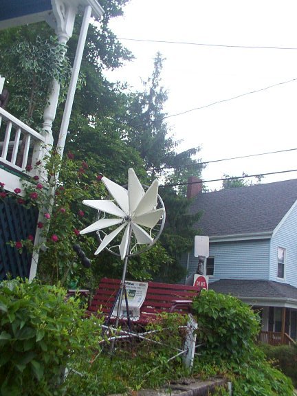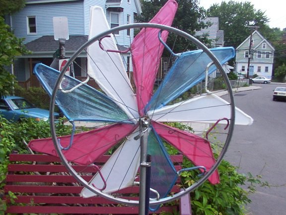 I love this thing. Philippe from Boston send me photos of his windmill he made with " a bicycle wheel, 9 plastic coat hangers, Styrofoam and tape. " He uses a clothes dryer belt around the rim to turn a small motor. Its very clever the way he used the coat hangers.