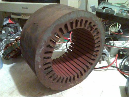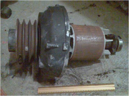 Part Two...a rethink Well, I discovered that a DIY freak such as me on a budget has to approach a new project with this mind set, "Build your toy with the building blocks available" and throw in the added touch of, "you are not crazy if you spend an afternoon gazing at one brick...imagining its usefulness and place in the scheme of things". As much as I like the idea of drawing a planned blueprint of a generator and then heading off to a mill to create your work of art is, it is beyond my budget. I don't have a mill and I can not afford to pay someone to do the work. This leans me towards the following thinking..."I want to create a generator, how I get to finish it will depend on what bits and pieces I have available". What I get to use it for depends on what I have created. Well, enough of the quotes and philosophising. I have removed the stator from the casing as I need to clean and reseal the laminations. I suspected the lams were not in great condition and affected to varying degrees by rust and general deterioration. I am going for a flexible high temp primer of some description that is not relatively conductive to reseal them. Here is a pic of the stator removed from the case...
