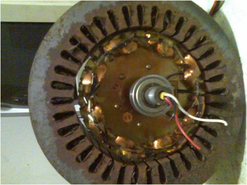 A painful job time wise and patience is needed not to distort the laminations when separating them from each other. The next picture shows that I think I have resolved my main issue...finding a rotor to fit inside the stator. I have several old ceiling fans in the back shed and I toyed with the idea of fitting a square peg in a round hole...