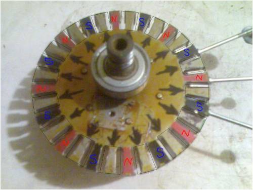 next picture shows what I plan on doing to my rotor...I will somehow remove each tooth on the rotor (marked with a faint black square on photo) and insert snugly fitting neo magnets. The ends of the rotor teeth will mechanically hold them in place (with the help of some glue and a retaining ring either side of the rotor to stop them jumping sideways... Once the magnets will be in place, the poles will be arranged like they are in the photo. I hope to try and figure out an ideal setup for a low RPM generator with a 36 slot stator. Any help and bullets will be very very very much appreciated....cheers again http://cr4.globalspec.com/member?u=25757 http://www.instructables.com/member/OzzyRoo/ |