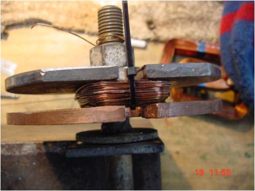 Sadly I forgot to get a pic of the coil itself. I needed 7 of them. 5 single coils, and 1 dual series coil. ie 2 coils wound 1 after another without cutting the wire between coils. We then place them into the stator and it looks like this