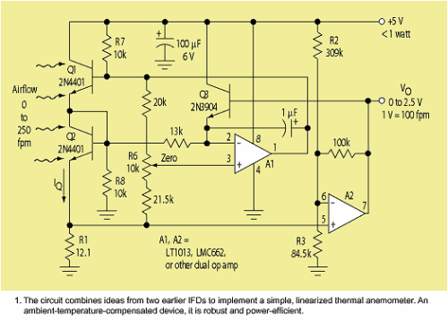 This circuit does not look as sexy as those spoons, but is +/- 5% down to 1 foot/min (virtually stagnant air) up to 250 f/min. (1.27 M/S or 4.6 kph or 2.8mph) with the above values.