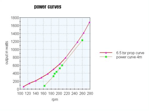 Here is a graph of rpm/watts. I have placed a line of best fit for the prop curve. TSR 6 was just far too much, TSR7 and the figures were impossible. TSR 6.5 closely fits the results, and the wind conditions on the day/s. According to the weather man, no gusts were recorded greater than 30kmh so TSR6 was not possible by a long way. It was a clam day by our standards. I think 20 mph would have been as good as it got. (32kph).
