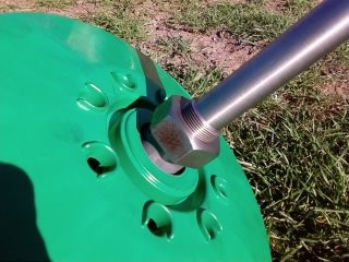I've thought of a different approach, having a large dia blade set , this on it's 'stand-alone" hub and axle. Then belt drive to a shaft that "dogs" into those 6 holes around the green cover. The dog clutch is free floating and will have rubber sleeves to take any alignment differences.