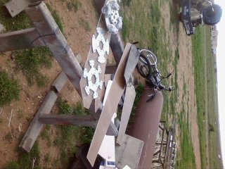im not sure if you have seen earlier posts but i have very good winds here, the house i am building has to be made to cat 3 because of them. I live on top of a hill with no trees, it was a lucern hay paddock previously. I have been testing for some time and must admit the results vary a lot even with the same stator wire sizes. Anyway its all fun. I have tried the 80sp as per econnovations book but get my best results from Glenns 7 pole star, its a good unit and almost any wire size gives good results. Now the alloy blades i made are 1200mm long x 5 mm thick the chord is 190 mm tapering to 75 mm at the tip,they turn okay but as i posted earlier the angle of attack needs to be greater. Here are the pistures of the boades and a couple of photos of a wind driven water pump i saw in Meningie in the coorong today, its 2 sheets of ton on a axle that pumped the water, very clever and simple!