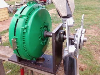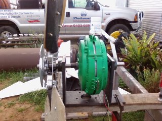 Hi Bruce, yes i am using slip rings and looked at the strength of the green shroud, Wayne my engineer freind said the shrouds strength is also in the orange fan that goes around it in the air conditioner. He feels that the removal of the orange fan surround leaves the shroud with just screws holding it together, basically its all a complete setup, and the only strength is in the outer ring the rest is just a cover to protect from moisture in the evap air conds. So the setup we have come up with puts absolute minimum pressure on the shroud, the fl205 bearings take all the weight from front to back leaving the shroud only to be held in a non rotating position. I spoke to dennis last night and we spoke about rewiring of the seely and i came to the conclusion to try the unit ( a 1500 watt x 24 v )as is in star. and use that info to build on. This unit will be pushed by 3 x 1200mm x 300mm chord x 100 mm tip fibre glass blades that i cut to size yesterday this will give .720 sq mts of blade surface area and should at least get it turning to get some results, i still cant work out how to convert jpeg files to zip or rar files to post on the site.
