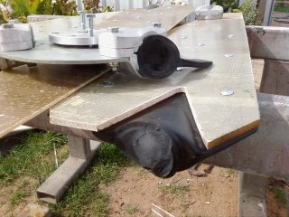 The black rear blade stubs,taperlock and retaining plate all come from Titan Fans in Adelaide at a cost of $83.00. The shaft cost $100.00 and the blades were cut from a retired submarine battery box at a cost of $50.00. The seeley was $45.00 from Dennis and all i need to makeup are the sliprings and furling tail.Friday will see the unit up on its neww pole.