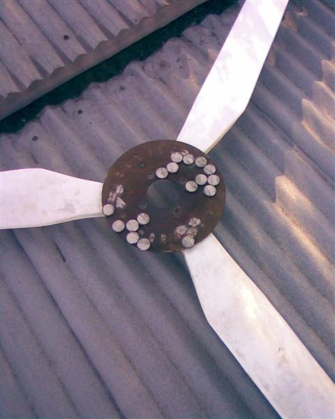 36 Rare earth magnets (35mm round x 3mm thick) mounted on 2 6mm thick steel discs(18 on each disc n s n s ..... arrangement)all based arround a trailer stub axel assembly(bomb proof with 2 tapered bearings taking lateral forces) 18 coils slightly egg shaped. The wide end of the coil is large enough so the magnets never cut both sides of each coil at the same time. Coils used to be flat(pancake style) and over laped so each magnetic field cut two legs of different coils at once. New coils have cross section of a pencil and are laid side by side. Coils are 1.1 mm square enamelled wire 50 turns each. Resistace calculated at .13 ohm each coil using volt drop across coil and a known current flow. 18 x .13 = somewhere around 2.4 ohm total resistance of windings. Coils in series, with finish of coil 1 connected to finish of coil 2. Start of coil 2 connected to start of coil 3 etc. Blades are fom that shop in the states which sells the chinese fibre glass blades. Blades used to be pvc. All charging total of 540 Ah 12 V batteries. Charger controller is a 35 A full wave bride rectifier (as out put voltage is tied to terminal voltage of the batteries) with ammeter in series to see what is going on.