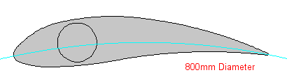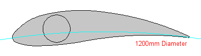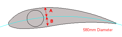 A Darrieus works best with a profile that is symetrical on the inside and outside of the swept path/diameter. The extruded blades have a curve, so I worked out the ideal diameter that would pass through the center of the blade profile. This path is shown in blue, and you can see how A = B along the length of the blades chord. This gave a diameter of 580mm.