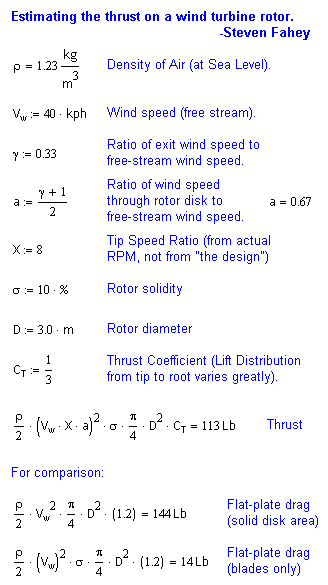 I suppose the question I would like to put up is - How does this caculation I used get the force acting on a turbine so wrong ? Even the example given of a 2m dia turbine in 20m/s ( 72klm) was worked out at 66.6kg thrust , that is almost saying you could quite easily hold a 2m dia rotor in a 72klm wind , to me I think it would have a lot more force than that ?