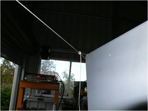 Because I already have built my tails and dont really understand all the sin, cos , tan , stuff I decided to use a spring scale and alter the angle of the tail pivot untill I reached the 4 - 5 Kg , and as I can change the blade offset from 0 to 200mm it would be the 1/2 way mark if I wanted to increase or decrease the furling moment . The pics below show how I set all this up using a piece of string to act as the resistance on the tail tip ( the wind) and the spring scale pulling at the point of the rotor centre .