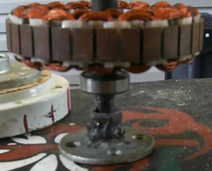 I toned out the leads and attached the two bridge rectifiers. Rigged up another dog bowl with a threaded rod to turn the motor shell. I hooked up the output leads to an old trolling motor as a load.