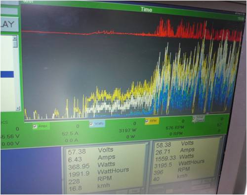 Well ,another day blowin a gale , I swapped the blades from the F&P onto the Ax the other day and put the old ABS blades on the F&P Dual . With the blade dia now down to 3.1m I figured it would not be able to get to the highs it had a couple of weeks back before the blade let go . Wrong again with a blast of wind coming through at 57klm it punched through 3 Kw ( 3197w @ 576 Rpm ) shown below the recording on the piclog. I have had it down quite a few times today to keep reseting the furling moment and have been keeping a eye on how hot it is running and after quite a long period of high output , I was still able to hold my hand on the housing for as long as I wanted , and no smells of heated resin coming from inside , which is a good sign