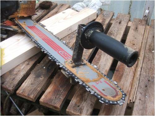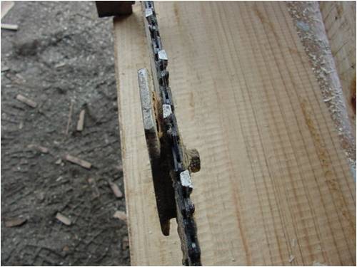 hi Oz had to think about this .....actually its more to do with the roller bearing at the base of the bar when the saw cuts it tries to pull away from me , if i was holding the saw normally i,d have the leverage to steady it ...usual chainsaw cutting ...using a handle you kind of lose this control the bearing though takes this load on so the saw is more stable , butted up to jig as it cuts ....i suppose this is really what allows the use of a handle .....(you dont have to concentrate on holding the saw steady when you get into the thicker root)... just push down and foreward now that i,m thinking about it ,the handle and bearing work together ...well at least on mine the difference i suppose is .. when i tried the chainsawing first i was never sure if the outer skid was tight on the jig or going for a little sponsored walk if i hit a knot (this was down to my saw handling ).....this way i,m sure , big difference for me the ripping chain does leave a better finish Oz ,it seems better suited to the cut but isn't necessarily any faster than regular chain (this is a bit immaterial as the cut only takes a minute or two anyway) ..the big difference on my saw was moving up to a 3/8 chain , it seems more stable during cutting (even with the chain slackened a little)..this could be due to the ripping chain also being more stable during the cut , ps...jarbar putting the handle on at a right angle is more natural to hold so probabely safer , either way you have a lot of control on the foreward skid ..it should also be easy to incorporate a proper guard around this area ...i like the ideas for protection putting a slip guard around the handle is essential which i,ll do before i use it again Pete i,m still using a file to sharpen but find the only way i can sharpen best with it is to take of the chain altogether and hold the teeth in a small vice ..the file seems to bite better for me this way...the diamond sharpener sounds interesting niall |