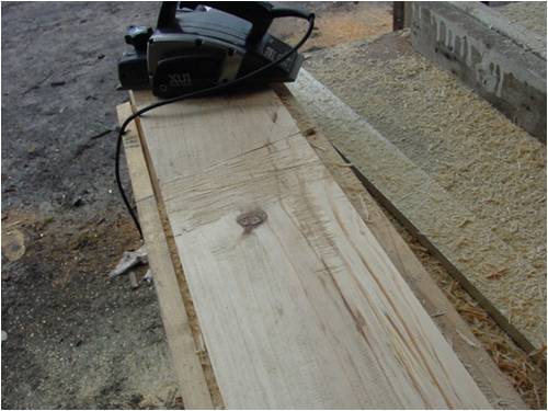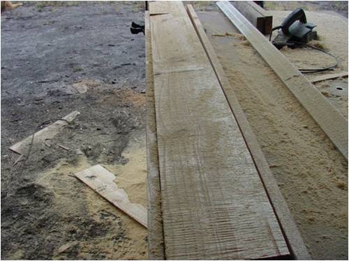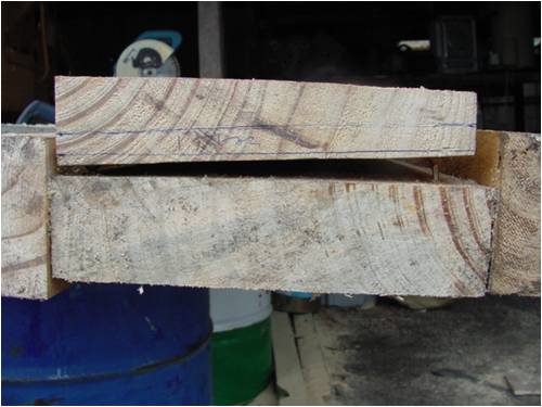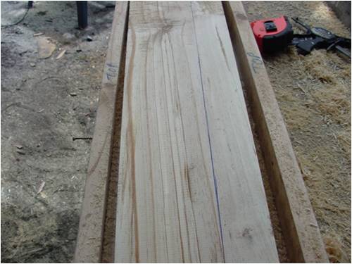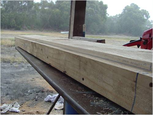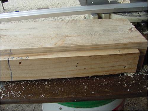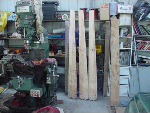 It's been some time since I did the original story on making your blades with a chainsaw. Since then I have had emails from people who did not quite understand how to do it step by step. Even though Imsmooth and Niall and others have video's on the web, it seems to not be enough... so I have decided to do a step by step story on these blades. It also gave me an excuse to see if better ways of doing things could be uncovered.... so here goes. I will preface this by saying that you can make a well twisted/tapered blade to whatever spec you can dream up with the blade calculators on the web, (see Nialls and Imsooth's video's) but my experience is different to what I had expected. The first set I twisted as much as the wood would allow (for 8x2"), and made the taper roughly follow the line of best fit... but similar to the blade calcs with an eye to the constraints imposed by the timbers dimensions. In short, a simple version of as close as I could easily get to the blade calc. I have since changed my mind after mindless hours of watching the mill.... I call it therapy... my wife calls it stupid... I am fortunate that my winds are so good and the exposure so good that it is still at ground level.. so easy to tinker with and watch endlessly.... and still easily do 3kw in mid winds... around the 30 mph range. I have decided to throw the calculator out the window, and design a woeful blade. I did not want a blade that was perfectly tuned to a specific TSR. It is rare to run at that TSR driving a battery bank anyway. I wanted a mongrel, that would perform well at any reasonable wind speed, especially lowish ones, and could not care about the high winds... not a thoroughbred.... I turn it off in high winds. I wanted it poorly tuned to any specific TSR, but able to operate with different parts of it at different wind speeds. So it was wider at the tips than the chart said, it was thicker in the chord than was correct, it had only slight twist, maybe only 10 degrees at the root, and 5 at the tips, and the taper straight from the tip to the hub area (about 400mm from the butt in my case). I was after more torque down low, more profile nearer the tips. and more chord.... and a soda to build. I can make a full set in about 2.5 hrs ready to sand I didn't sand them because they were too wet with resin... sand paper doesn't work then. But the design is so simple, the planer finished them near perfectly anyway. This will take up some of Gizmo's bandwidth.... sorry.