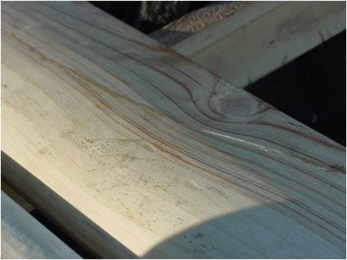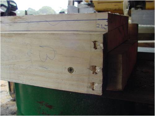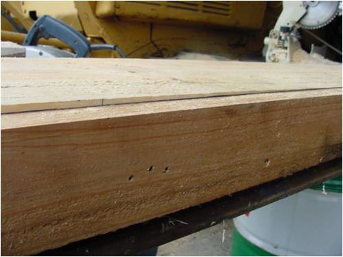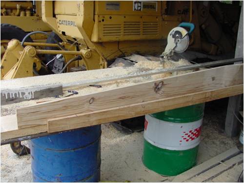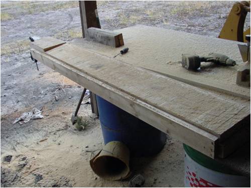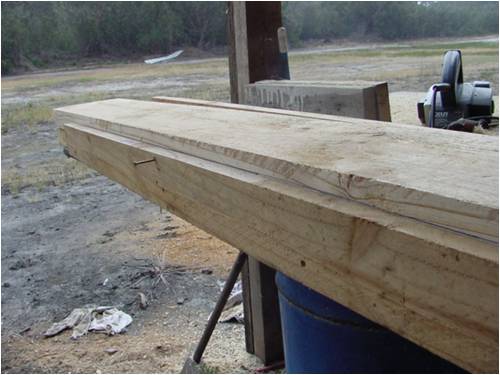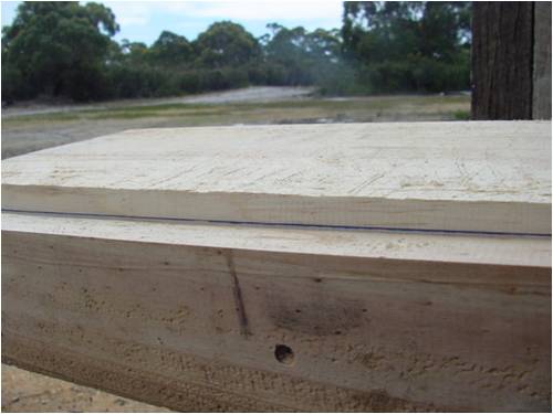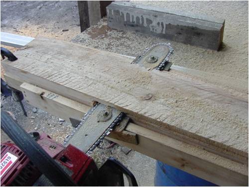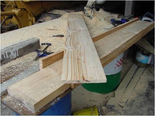 Note, with regards to measurement.... not many people want 4m of blade, so you will have to work out the measurements for your blade size anyway, but you should get the gist of it. First.... we get the essentials. A saw, chainsaw, chunk of forest, the power planer and the grinder with flapdisk (this will sort of sand resin soaked wood) and other assorted knick knacs... like a tape measure perhaps.... Most other folk will buy properly dried, dressed timber, and select the best at the shop without knots.... I got a chap on the other side of the island to hack some 8x2 pine with instructions to try and get reasonably seasoned knot free stuff.. you don't always get what you ask for over here, but it is wood.... the similarities end there. Any way, dock the end square: Make at least both of the edges clean and straight... we need to draw on them to make the jigs, and one side will be the leading edge.... so straight is nice. We need to have made our blade modifications by bolting on two slides to the blade like these: I use another 8x2 undressed... so it is slightly wider than the dressed one to use as a base plate to build the jig on. Grab some straight 3x1" ... mine was from an old packing crate, so I had to true it up first with the planer... it must be straight on the top. It will be screwed to the side of the base plate 8x2 such that it will leave a gap to the top of the blade blank 8x2 that is the equivalent to the cut depth you have made the slides on the blade for... plus how much meat you want to cut off.. It helps to do a dummy cut on some spare 8x2 to establish this measurement... Note the base board, the blade timber, and the side jig timber: Mine was about 8mm. This means that where ever the side timber is, the blade will cut 8mm above this. IMPORTANT!.............................................. Your chainsaw may be a bit ratty like mine with an old cutter bar and chain. With this in mind, you may do well to leave 2-3mm more meat behind than the proper figures suggest....Mine ... well you can move the chain teeth about 3mm side to side.. so 8mm + 3mm safety=11mm above the cut line..... keep this in mind for the remainder of the story. It doesn't look it, but the line is the same all the way, so the blade will just graze the 8x2 on this side.. and yes it's raining yippee!!.... Hee hee... just graze... not really. In my case, the wood is rough cut and not straight... so I will be gnawing into the face a few extra mm to get a true straight /flat face... ie I can't rely on the wood to be true.... especially three times in a row. Some will be 52mm, some 48mm and some 50mm. So I will be removing more than is traditional for the face. Normally the leading edge will be the top corner edge of the timber. Now for the other sides timber to guide the slide on the chain saw. Here, we guess how much angle we want. I wanted the tip to drop across the 8" by about 10mm. I don't know how many degrees that is, nor do I care, but it felt about right. I hadn't really decided on the tip width yet
