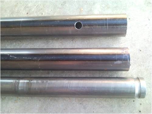 Then tapered the ends of the 22mm dia, 680 mm long solid bar as suggested. The other end I machined a groove for the ubolt to locate to prevent the blade from coming adrift. Drilled 4 holes for plug welding into the 25 mm, 1500mm long od tube, the last hole being 100mm from the end of the solid bar. .