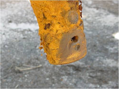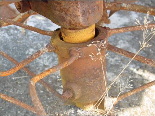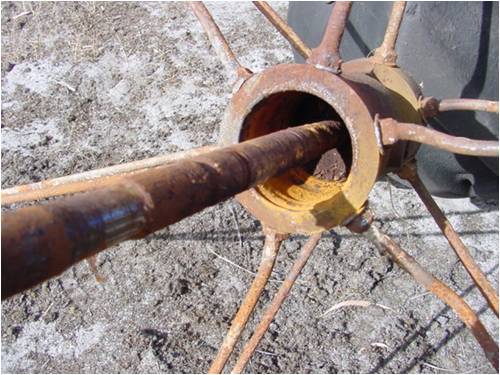 Ok. It does appear to be as I suspected first off. I went up the scrub and found this: It was not well. Fell over in a storm and the owner dumped it here. Here is the clearance from the hub to the casting. There is no way a grease fitting of any kind would be useful here. That theory is out I think.: Here is the offending bung. It is straight through the hub to the big cavity. Note, the part of the casting with the bung, does not hold the shaft. That thinner last 2" or so is the only part that contacts the shaft steel. It has no grub screws, pins or any other mechanism to lock the shaft in. It is multi ton press fit ... and thats it. Any other system would not work, as there is not enough shaft to sensibly stabilize the hub to shaft if the fit was not very very very tight. For those curious, this is how the spokes are set up: Here is the inner of the hub. 80% of it is hollowed out. You can see the ribs there. These keep the oil from the shaft rotating around the inside for reasons unknown. I suppose it does keep oil around which is good. This next shot is the clincher. Notice the teardrop depression in the cast coming from the hole. This directs the oil away. It is this hole where the oil from the journal exits, so it leaves from the highest point, so the shaft should be floating in the oil in the journal. It weeps out this hole, and runs down into the hub ribs. So I think that about covers it. That bung does no more than empty whatever water and oil has accumulated since the last service. Half the bolts snapped while I took this apart Gizmo... you'd better be thankful ..... and that doesn't count the ant that took a chunk out of me as well....